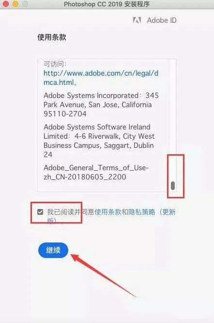 7.将滚动条拉到最下面,勾选“我已阅读并同意条款” 点击继续。