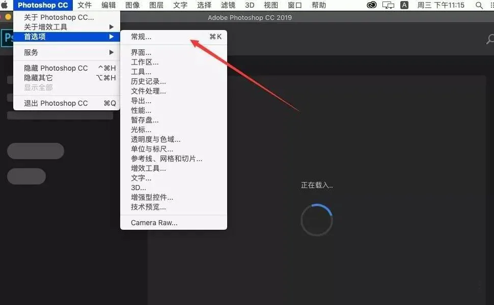 18.打开PS2019软件后,如果首页欢迎界面一直显示“正在载入”,点击左上角-首选项-常规。