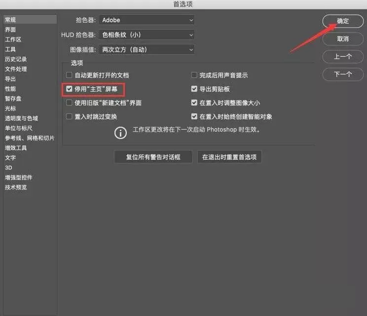 19.在首选项窗口中,勾选“停用主页屏幕” 点击确定,重新打开软件。
