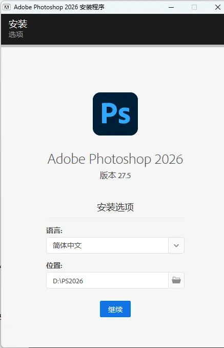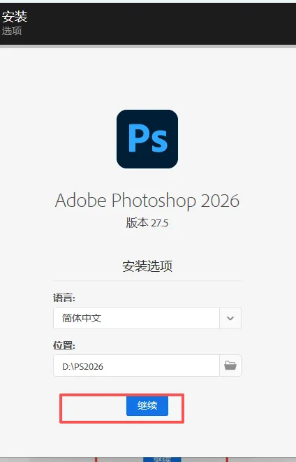 4.修改安装位置:①点击需要将软件安装的磁盘位置(如:D盘)②新建一个【PS2026】文件夹并选中③点击【确定】。