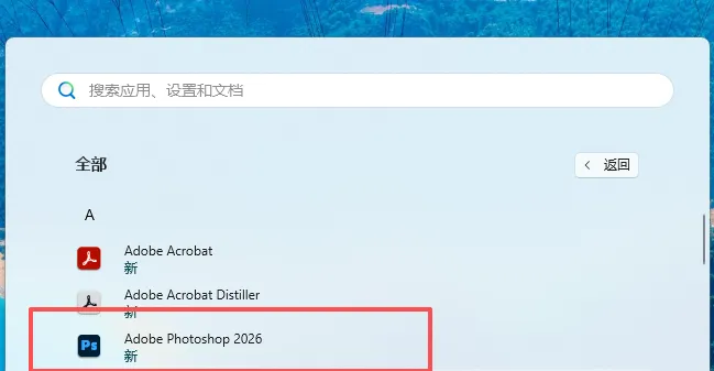 8.创建桌面快捷方式:①点击桌面任务栏中的【开始图标】>点击【所有应用】②将【Adobe Photoshop 2026】图标拖到电脑桌面。