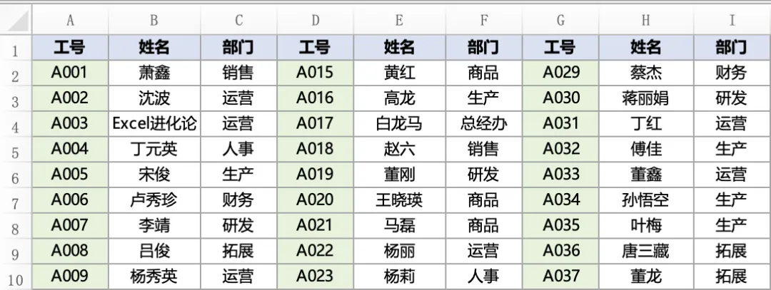 既然VLOOKUP只认“第1列”,那我们就把所有工号都放到第1列,所有姓名都放到第2列,做成一张干净的“标准表”。=VSTACK(A2:C10,D2:F10,G2:I10)