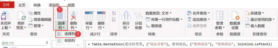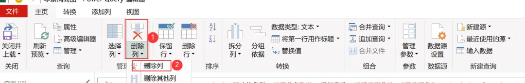 【删除其他列】使用的公式(与【选择列】使用的函数相同):= Table.SelectColumns(源, {"日期", "订单号", "销售地区", "销售部门"})