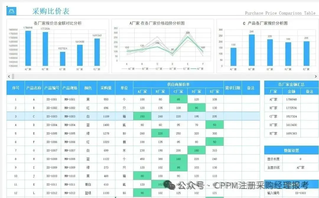 今天分享采购价格对比表,一定要存好,未来一定能用到,带图表分析,带数据高亮,并且还有报价排名表,内置函数公式自动对比分析,只需要输入数据,就能一键生成详细的对比数据,省心又省力,好用👍