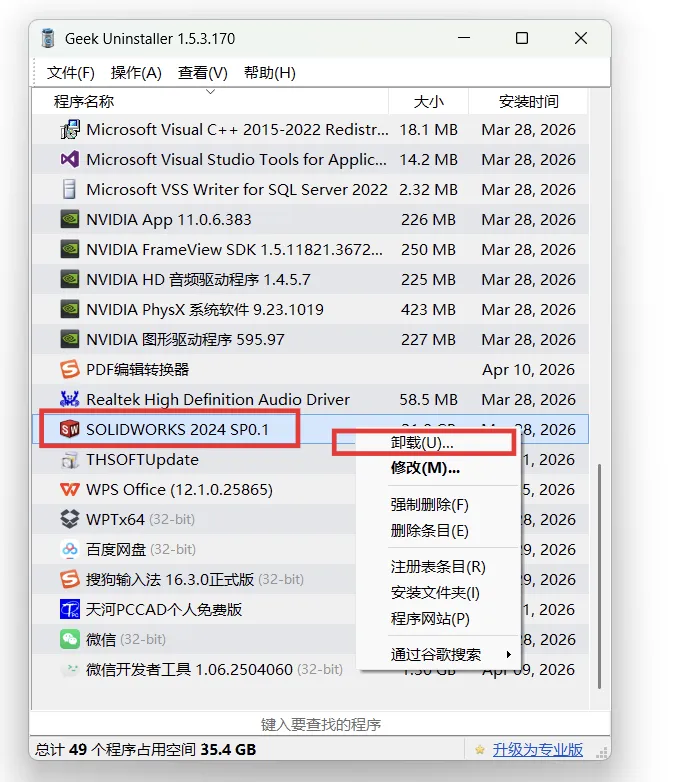 使用第三方工具辅助《Geek》,扫描SolidWorks的残留项后一键清理,再配合上面的手动步骤补充清理即可,效率更高,适合不熟悉手动操作注册表的宝贝。
