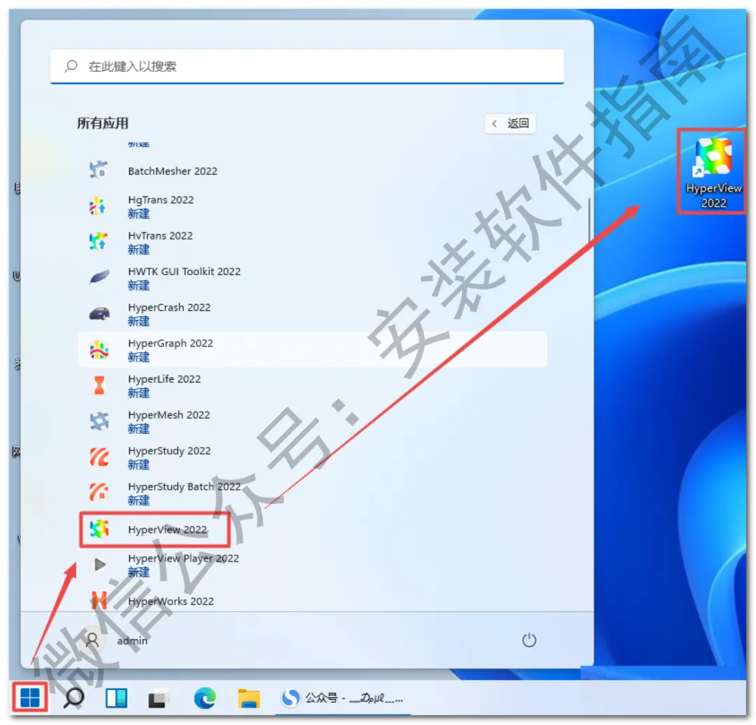19.在桌面左下角的开始菜单中找到"HyperView 2022"软件根据需求可以选择HyperMesh、HyperStudy、HyperWorks等软件),鼠标左键拖拽到桌面上即可创建桌面快捷方式