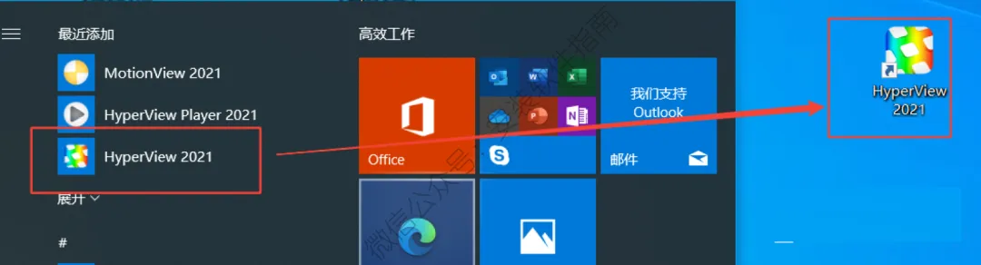 22.创建桌面启动快捷方式:❶点击桌面左下角【开始图标】,❷在菜单栏中找到并拖动【HyperView 2021】图标到电脑桌面