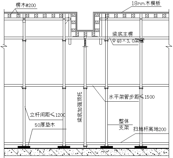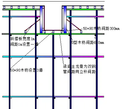 (3)、梁板模板支撑系统要求,立杆下部必须垫50mm*90mm木枋,立杆间距