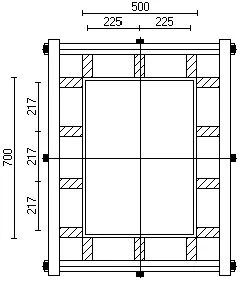窗、预留洞模采用18mm厚的胶合板和50*90木枋定型,对于小洞口模板其角用50*90木枋撑于内角,侧面用铁钉将胶合板固定在木枋上。对于大洞口除采用上述措施外还必须在内侧上、下、左、右用木枋进行顶撑。详见下图