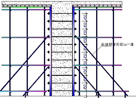 (5)、墙柱模板加固要求:第一道加固水平钢管距离地面不大于200mm,其余各道加固间距不大于500mm。