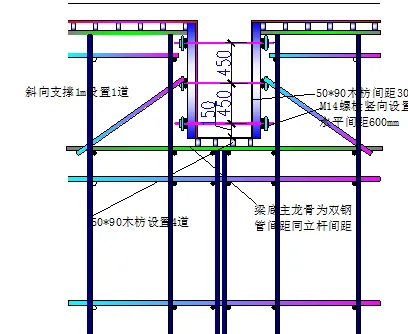 剪力墙内楞骨采用50´100mm木方,间距为250mm,外楞骨为双钢管48mm×3.0mm,间距450mm。