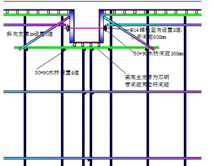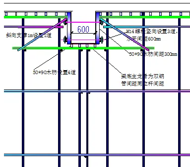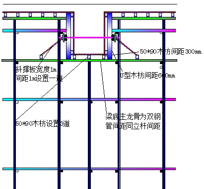 对于高度大于600mm的梁,在两侧设置对拉螺杆,对于高度大于700mm的梁在梁底设置承重杆,在纵横向梁交叉点设置承重杆,两侧模板及梁底木方要求同板模板要求,但梁底木方间距由计算得出。同时,对于跨度大于6000mm的梁按照要求起拱。