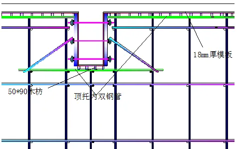因后浇带模板后拆,故后浇带采取独立模板支撑体系。在后浇带处留设两排立杆作为独立支撑体系,纵横间距800。板、梁、墙处后浇带部位模板采用快易收口网,后浇带板处快易收口网与钢筋扎牢固定,其中墙及梁上用木枋及φ12钢筋@1000与结构钢筋点焊顶撑固定快易收口网。