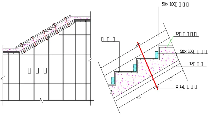 为提高楼梯砼的整体性和成品保护,本工程楼梯模板采用封闭式支模方法,即踏步面用模板封闭,螺栓穿梯板紧固,楼梯在剪力墙相应位置开槽,与剪力墙砼一起浇筑,楼梯模板在支设前应放出足尺大样,根据踏步的尺寸配制倒三角,现场拼装。支模时每个踏步应留排气孔,螺杆间距按500设置。