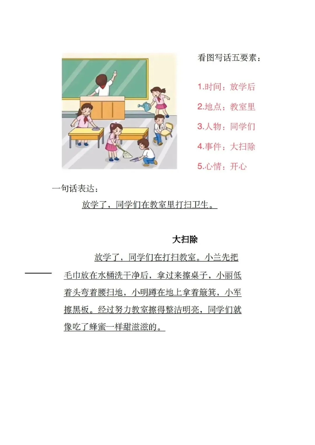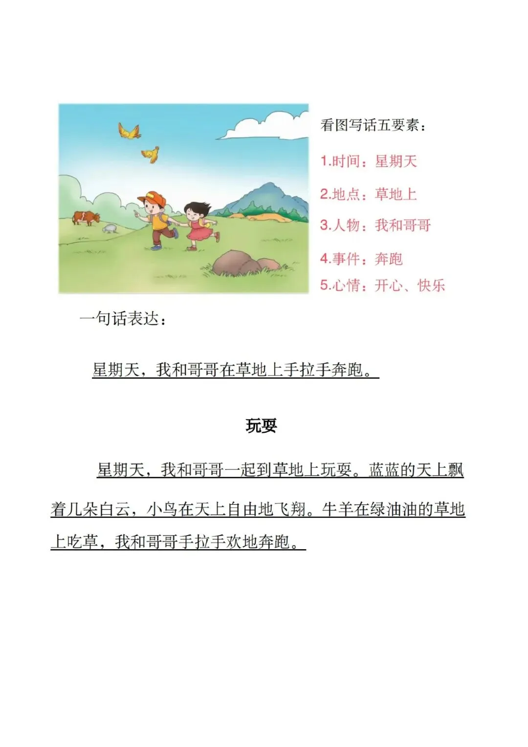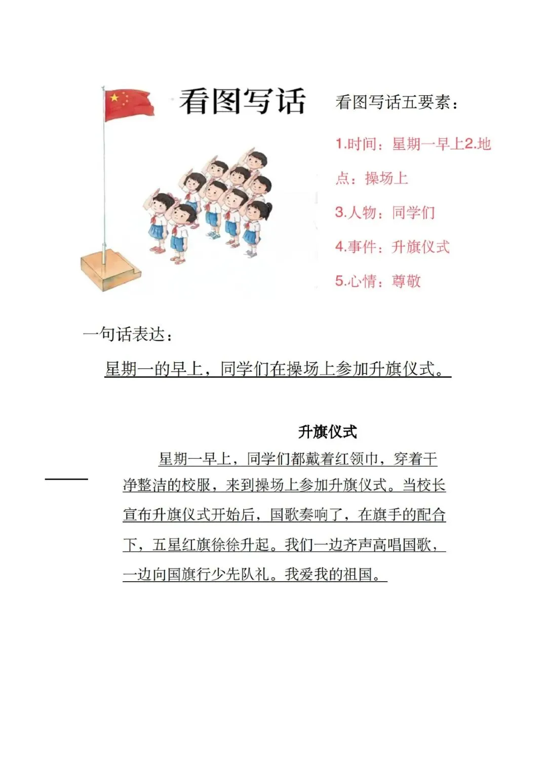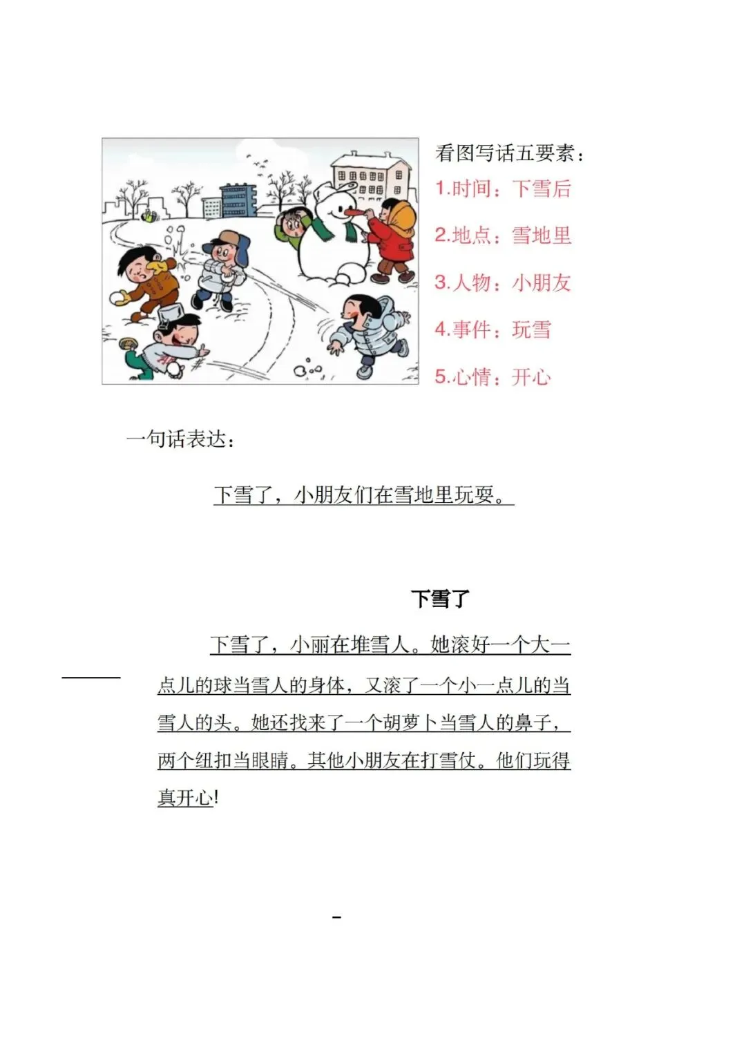 大家好,这里是淘学学资料库,这份《新看图写话范文版》,完整 pdf 电子档共 20 页。这份资料专为低年级看图写话打造,先教五要素写作法,再给出运南瓜、大扫除、堆雪人、升旗仪式等多篇高频范文,每篇都标注时间、地点、人物、事件、心情,还有一句话概括,语言简单好模仿,孩子一看就懂、一学就会。这份资料贴合低年级考试常考主题,范文篇幅适中、用词规范,既能帮孩子快速掌握看图写话的思路与结构,解决不会写、写不长的问题,还预留空白练习模板方便实战演练,日常晨读、考前背诵都适用,能有效提升孩子写作水平和语文表达能力。