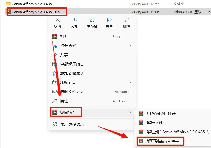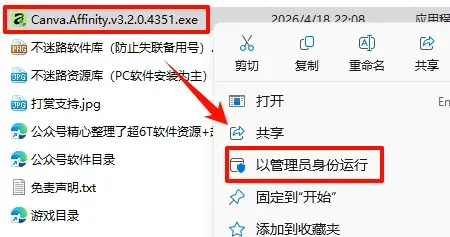 2.打开刚刚解压的文件夹,鼠标右键点击“Canva.Affinity.v3.2.0.4351.exe”选择“以管理员身份运行”