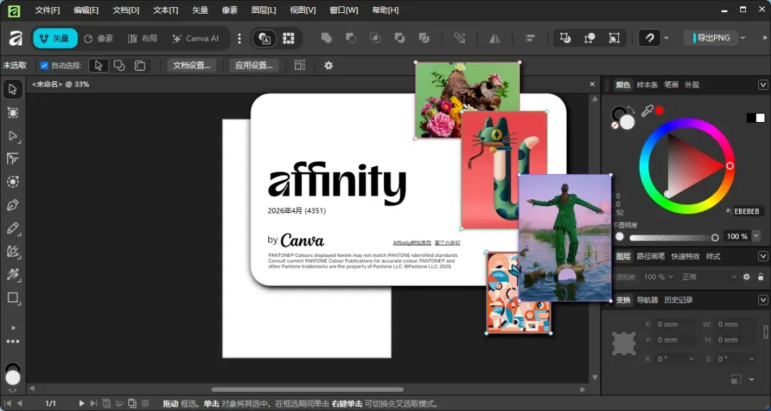 Affinity 3(也称为Affinity by Canva)是由 Canva 发布的全新专业设计软件。是将原有的三款 Affinity 设计软件工具(Affinity Photo、Affinity Designer、Affinity Publisher)整合为一个三合一的应用程序。目前已经包含中文界面矢量图形设计Vector功能、中文界面照片编辑Pixel功能、 中文界面书籍出版排版Layout功能。现在只要安装一款Affinity 3图像编辑软件就可以拥有Affinity Designer、Affinity Photo和Affinity Publisher软件功能。全新版本Affinity 3集成Canva智能AI工具,提供生成填充、扩展编辑及背景移除功能,不过免费版Affinity 3软件用不了智能AI生成式功能。软件安装