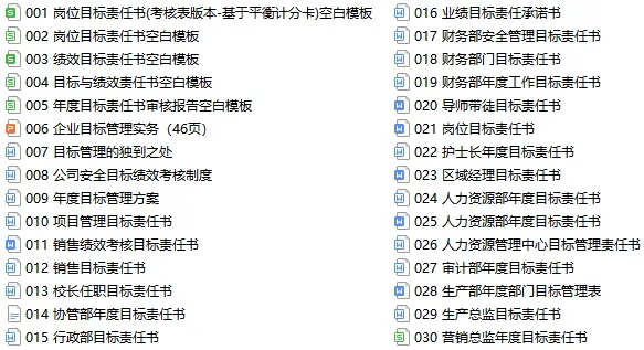 《年度目标责任书》资料包内含21份不同岗位的目标责任书,以及5份目标责任设定模板,1份企业目标管理实务PPT,1份公司安全目标绩效考核制度,1份目标管理干货,共计30份文件。