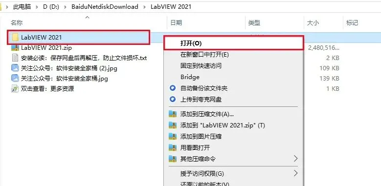 1、下载LabVIEW 2021软件安装包到电脑上,右键选择【解压到当前文件夹】。