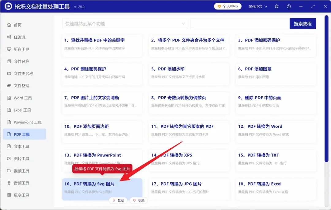 此时,直接点击列表中的“PDF 转换为 Svg 图片”功能,进入对应的批量处理页面。