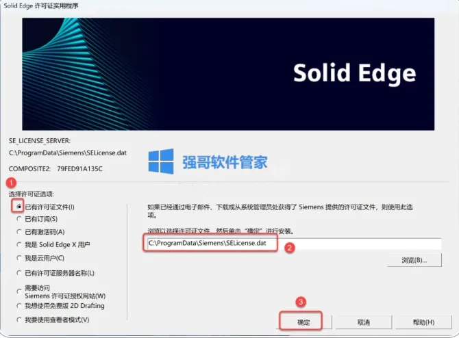 20.验证许可:①选择【已有许可证文件】②输入【C:\ProgramData\Siemens\SELicense.dat】③点击【确定】