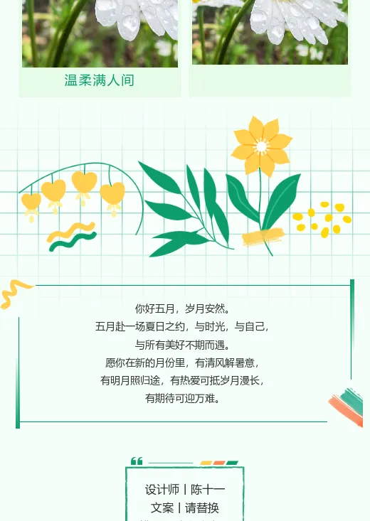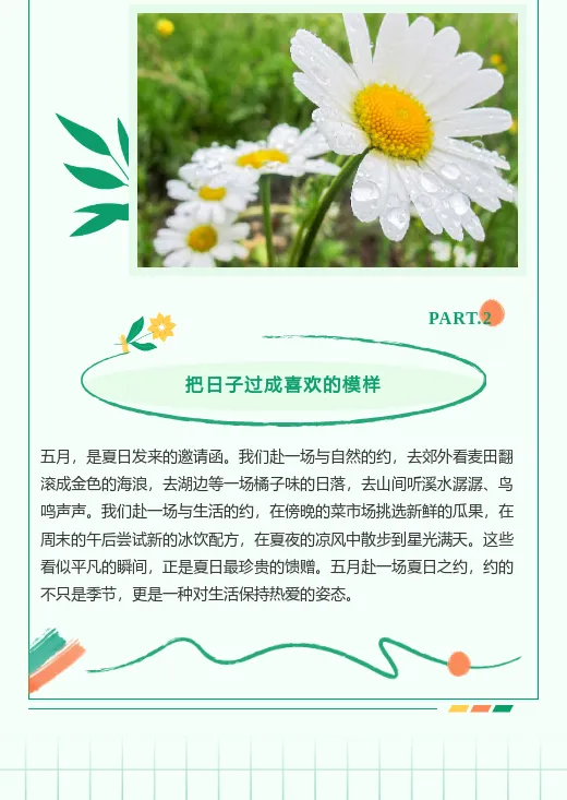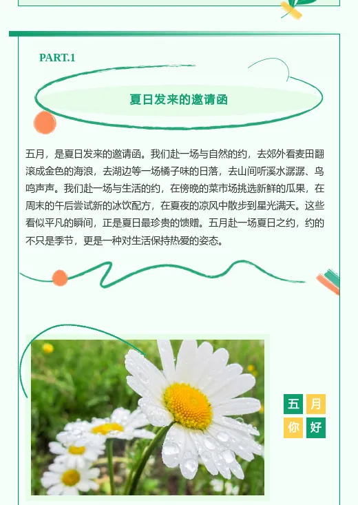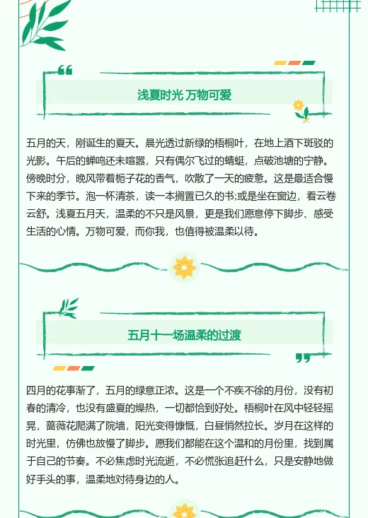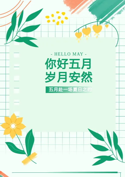 季节元素: 五月主题可加入初夏、立夏等季节性元素,但要注意不要与模板原有风格冲突。