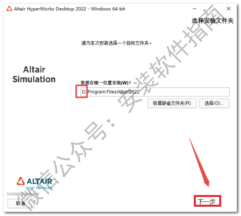 7.点击“选择”可以选择软件安装路径,建议和教程中的保持一致,本例安装到D盘(将路径地址中的首字符C改为D表示安装到D盘,或者可以在其它磁盘里创建一个新的文件夹,安装路径不要出现中文),点击“下一步”