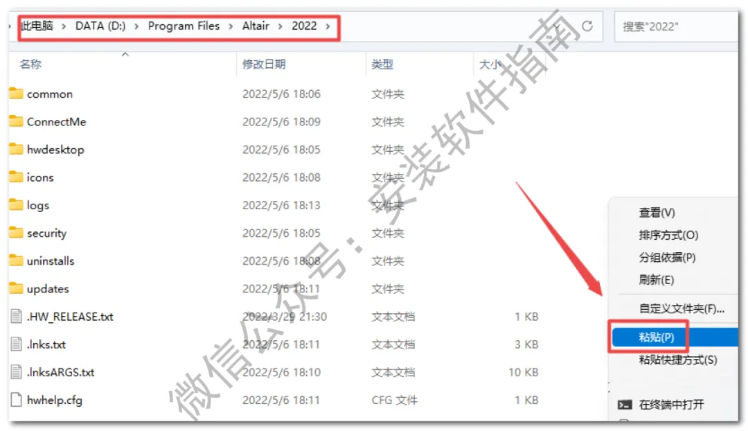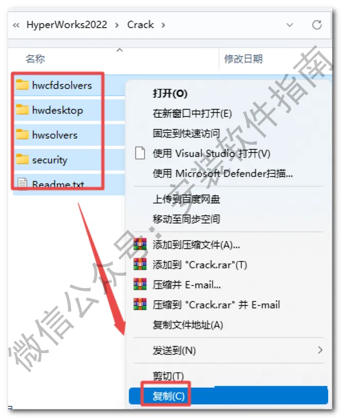 返回之前解压的“HyperWorks2022”文件夹,双击打开“Crack”文件夹,找到并选中该文件夹下全部文件,鼠标右键点击“复制“