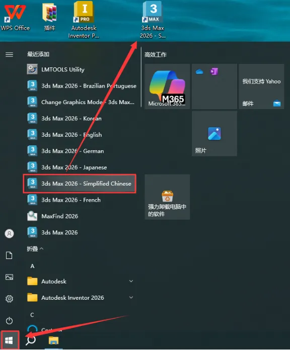 等待安装完成后,从开始菜单找到"3ds Max 2026 - Simplified Chinese"拖拽到桌面创建中文版快捷方式。
