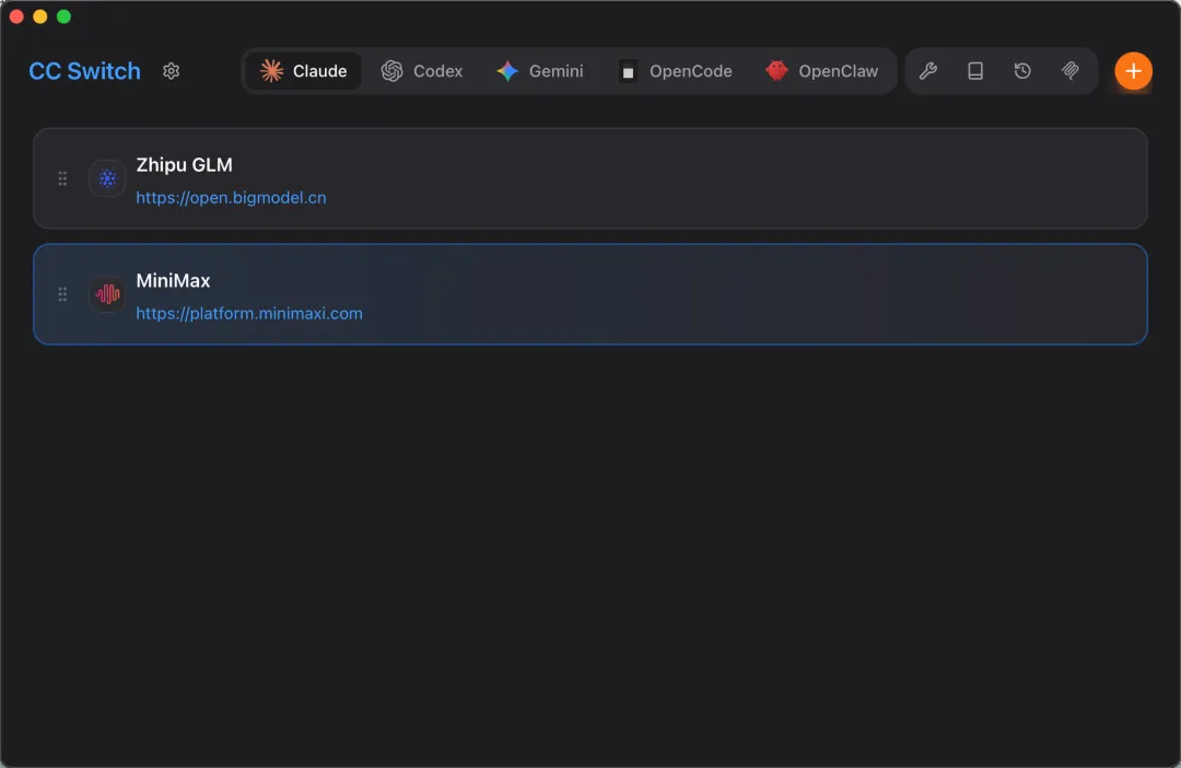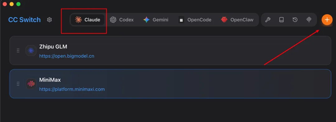 这里笔者也简单介绍一下cc-switch的安装和配置,我们以针对claude code配置mini-max模型为例,tab栏指定claude code后,点击加号:
