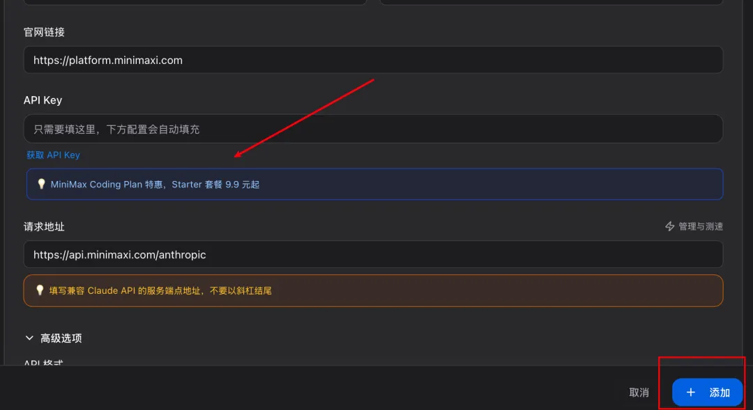 键入我们的api-key,cc-switch就会帮你生成剩下的配置信息,我们直接点击添加即可: