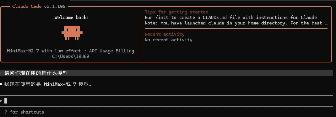 此时,键入claude 即可在输出面板看到当前模型为minimax-m2.7,当然笔者这里为了验证连通性,同样采用了交互的方式询问模型,也同样输出minimax-m2.7: