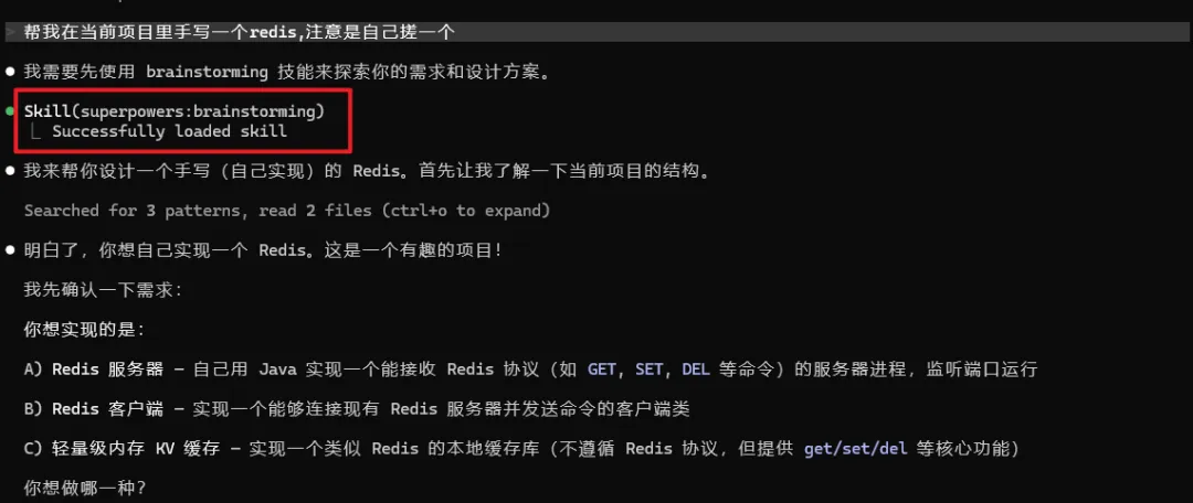 可以看到Claude code准确的加载了superpowers,并在了解项目结构后,用该技能的brainstorming进行头脑风暴和澄清: