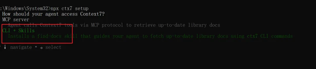 键入上述指令后,context7会询问用户安装mcp的方式,这里笔者推荐采用cli+skil的方式,它会非常详细的引导你完成必要登录注册,并完成claude的配置工作: