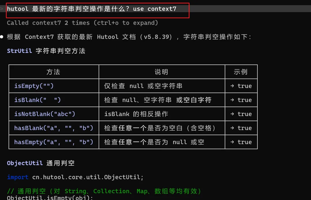 查询库id:调用 resolve-library-id,传入 "Hutool" 和查询关键词,获得/chinabugotech/hutool(版本 5.8.39),这一步因为走context7的原因所以并不是最新,而是相对较新查询文档 :调用 query-docs,传入库 ID 和完整问题 "string empty check validation isEmpty StrUtil",Context7 从其文档库中检索相关内容并返回 整理回答 :将返回的文档整理成表格和代码示例给用户