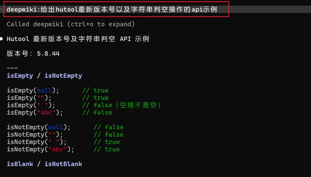 使用方式也很简单,使用deepwiki+问题即可,例如:笔者本次要求检索hutool最新版本的字符串操作示例,对应的问题就是:
