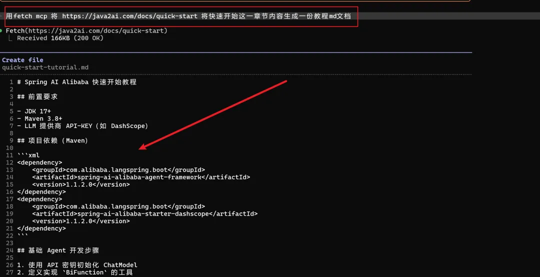 而使用方式也很简单,例如笔者最近一直想使用spring系的智能体框架进行一些智能体的研发工作,为了能够快速上手且沉淀文档,我们就可以将链接地址提供给fetch mcp,确保我们在技术可行性验证后生成md文档方便我们后续复用: