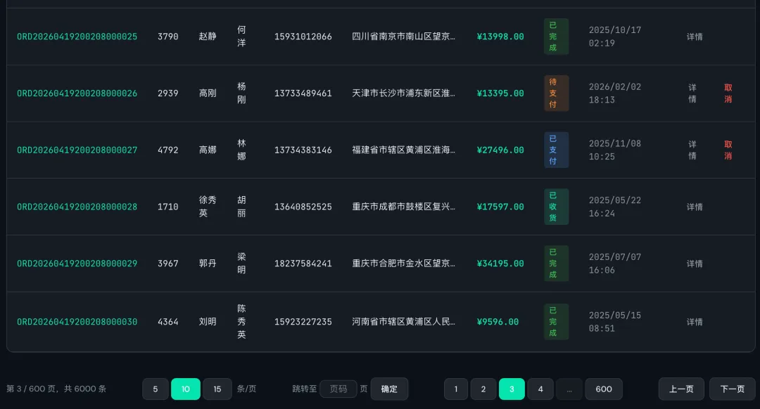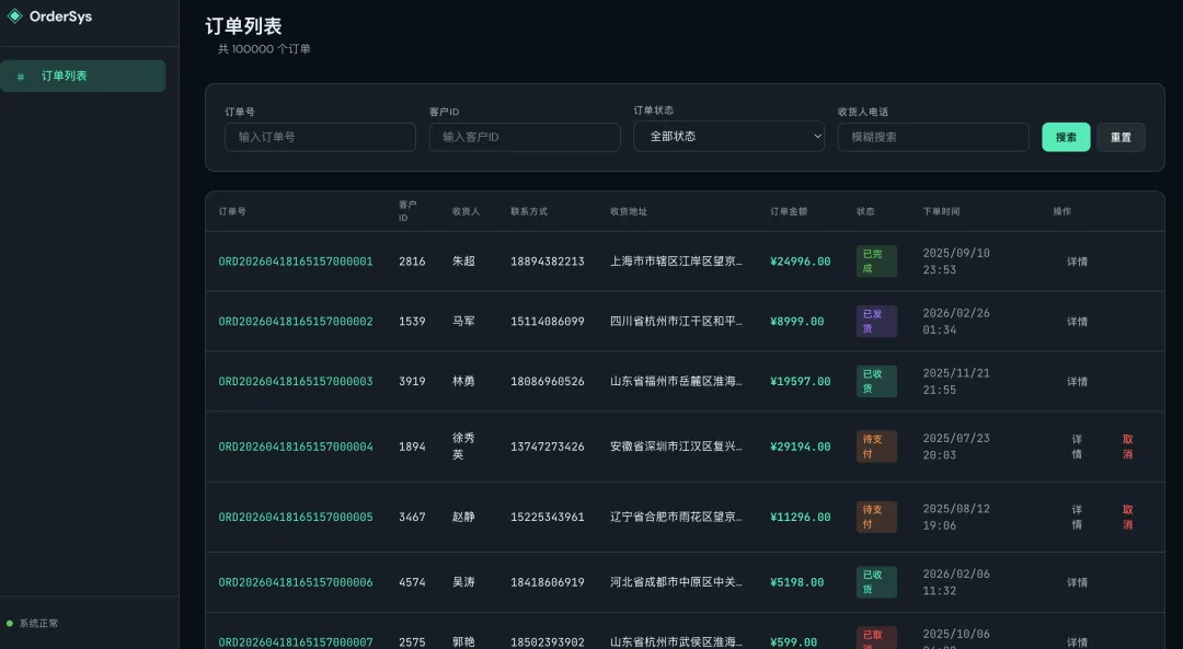 通过上述步骤,我们很顺利的完成了个人AI编程环境的搭建,为了更直观让读者了解claude code企业级开发流程最佳实践,笔者专门准备了一个订单管理系统,对应的系统页面如下图所示,可以看到该是针对订单订单明细管理的运营端系统,该系统目前支持: