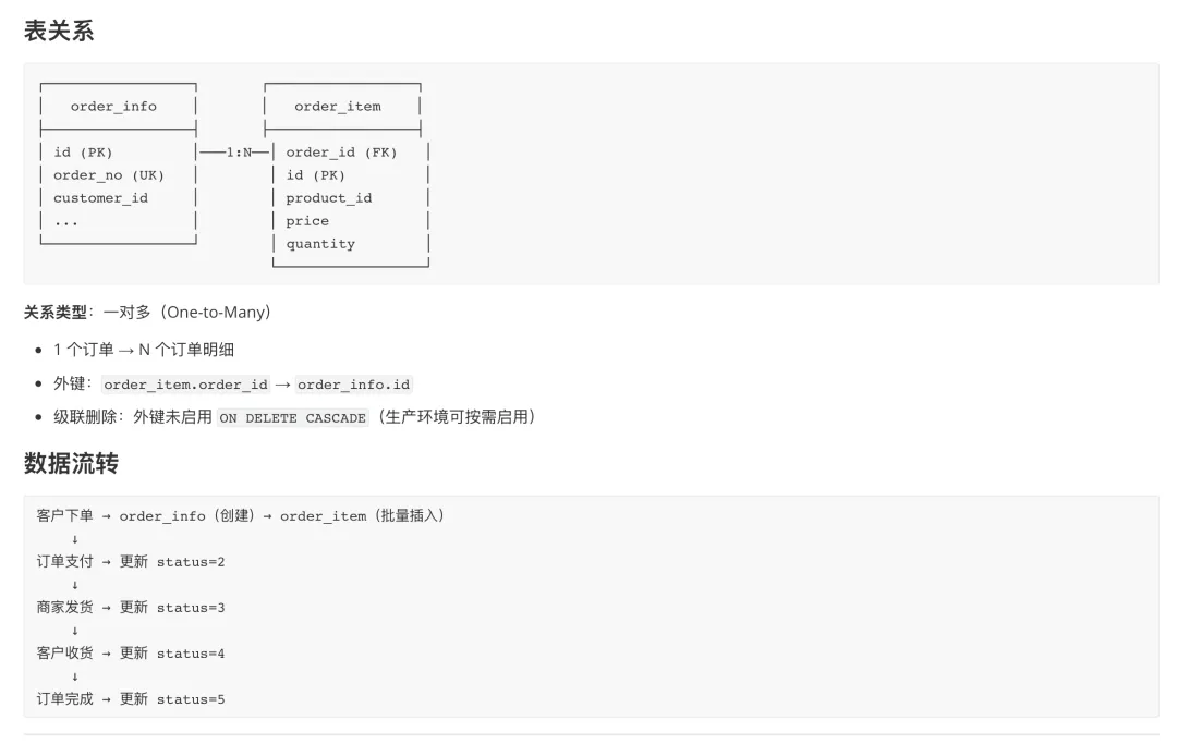 对应的笔者这里也给出claude code输出的md文件中最核心的,也是笔者最关心的一段描述,即可订单系统的核心数据表管理和数据流转图。可以看到claude code非常细心通过er图直观的绘制图核心表关联关系,并结合这张表关系构建出一条完整的业务流线,供我们熟悉客户下单的完成流程和数据流的扭转: