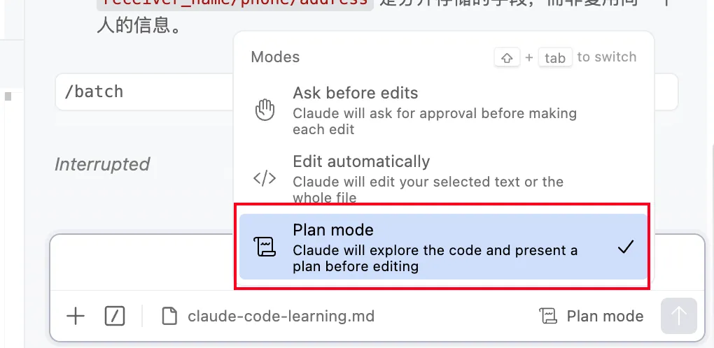 考虑到企业级项目的开发规范的重要性,本次指定的规范需要严格审核后才可应用,所以笔者将mode设置为plan mode,对应命令行启动的用户可通过**/plan** 切换为计划模式,即先审核方案,明确无误后再执行。