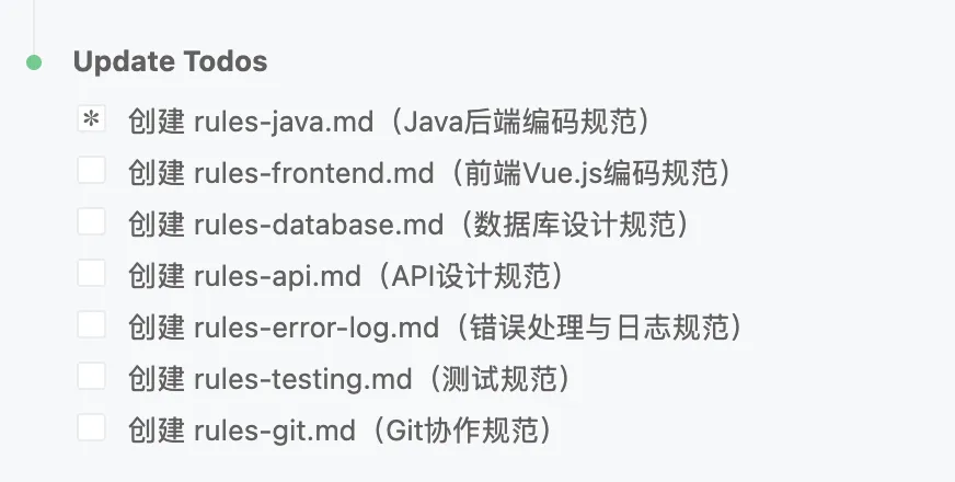 最终,在cc多轮询问之后,准确的在.claude 目录下创建了如下各种编码规范,并创建todo清单逐步生成: