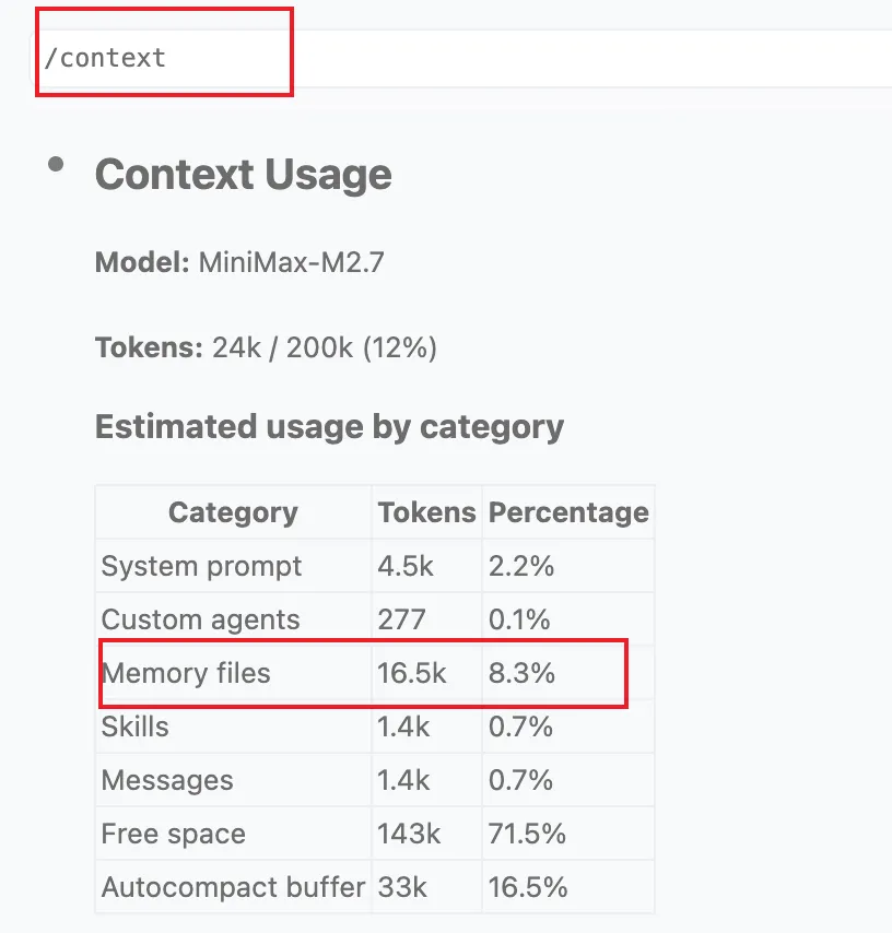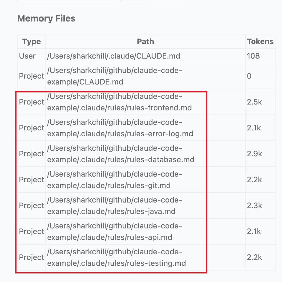为了印证**/rules是否对生效,我们可以键入/context**指令查看当前上下文是否成功加载。对应输出结果如下,可以看到memory files存在占用,由此推测本次会话加载了相关的物理文件: