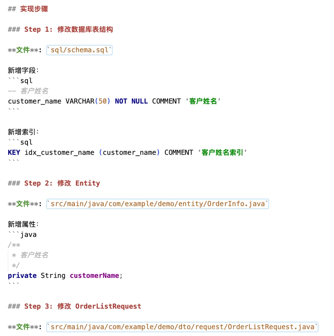 明确澄清所有不明白之后,cc直接给出一套预设计方案,很详细的给出前后端落地细节和表修改步骤,如下图,可以看到cc的方案非常标准从实体层一路修改至接口层,并完成前端模块的适配改造: