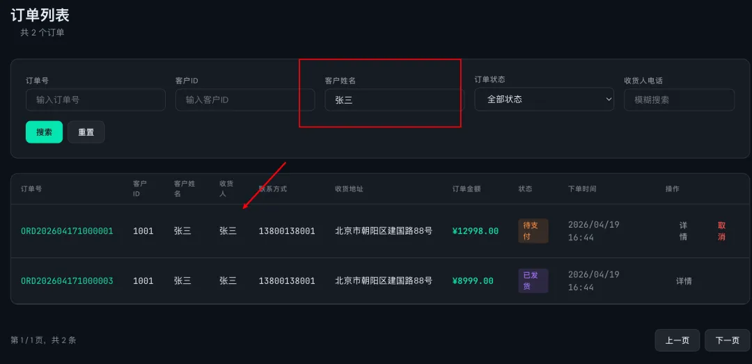这里我们结合业务补充说明一点:客户id和收货人姓名并不是一一对应的关系,客户人在我们系统代表的是本次下单的用户信息,而收货人则是本次下单指定的用户信息,并不是一定是当前客户。