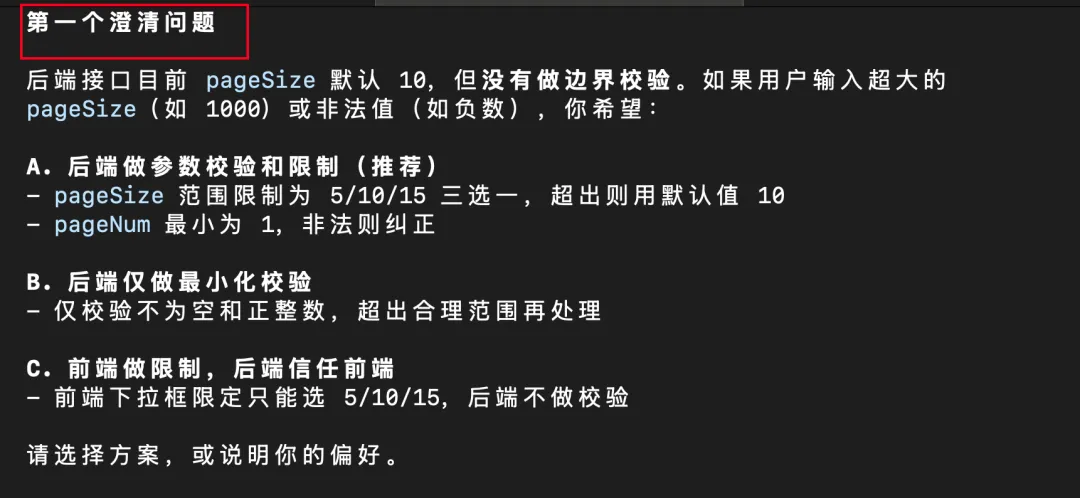 明确第一个问题后,cc经过思考分析,还是坚持用superpowers进行进一步澄清,询问跳页的前后端交互实现,这里我们直接选择A选项,不难看出,在给定准确的业务上下文信息和编码规范之后,结合superpowers这种苏格拉底式的追问澄清,它不仅可以帮助我们理清既有的实现方案,还会辅助我们发现一些可能没有注意到的边界问题: