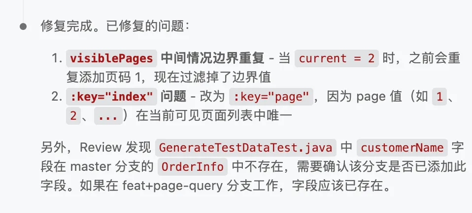 最终,cc结合代码上下文感知到本次迭代修改影响到了分页查询组件的边界渲染,也非常出色的修复问题,同时针对性结合本次变更的两个分支给出版本管理的建议: