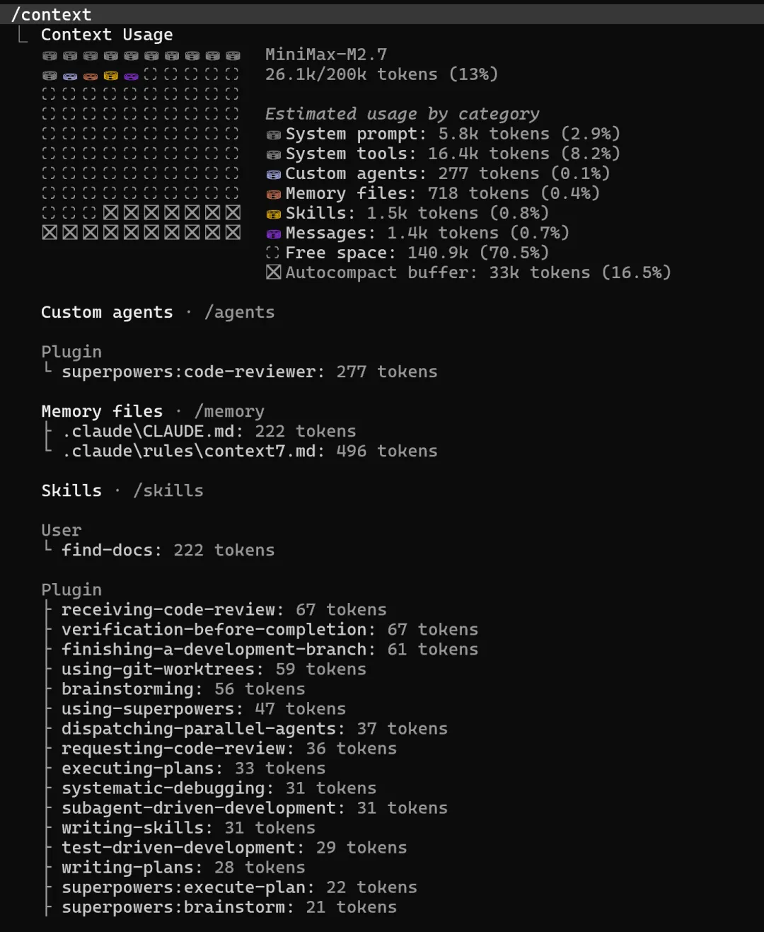对于我们可以使用**/context**指令查看当前会话的上下文使用情况,以笔者也为例,对应的输出结果如下,可以看到笔者当前上下文情况为: