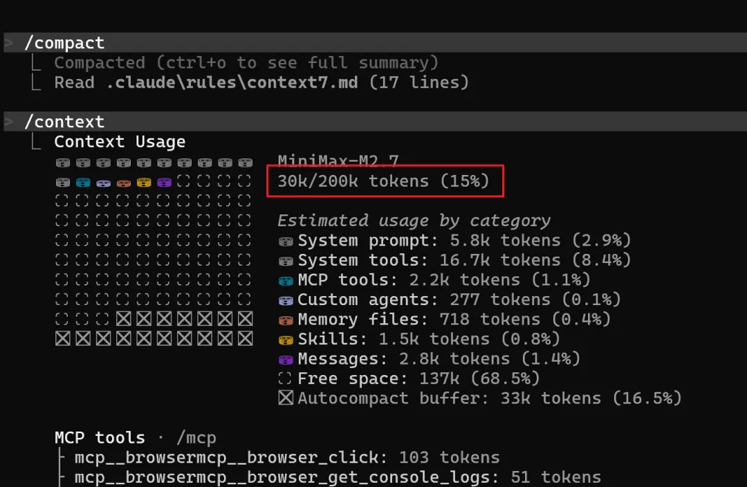 可以看到在笔者**/compact**压缩之后,上下文token占用直接压缩为30k,居然不减反增,这就说明若需要保证若非必要的话,我们需要调整一下Claude.md和rules这些信息,进行必要的上下文裁剪,保证上下文窗口处于一个合理且易于多轮交互的区间内: