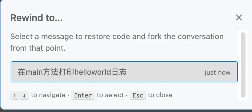 为了回滚该对话的变更,笔者直接使用/rewind,于是控制面板就输出了我们所有的对话信息,因为这是全新的会话仅显示我们唯一一次输出代码的会话,这里我们直接点击该对话,cc就会将其会话到本轮对话前的工程上下文: