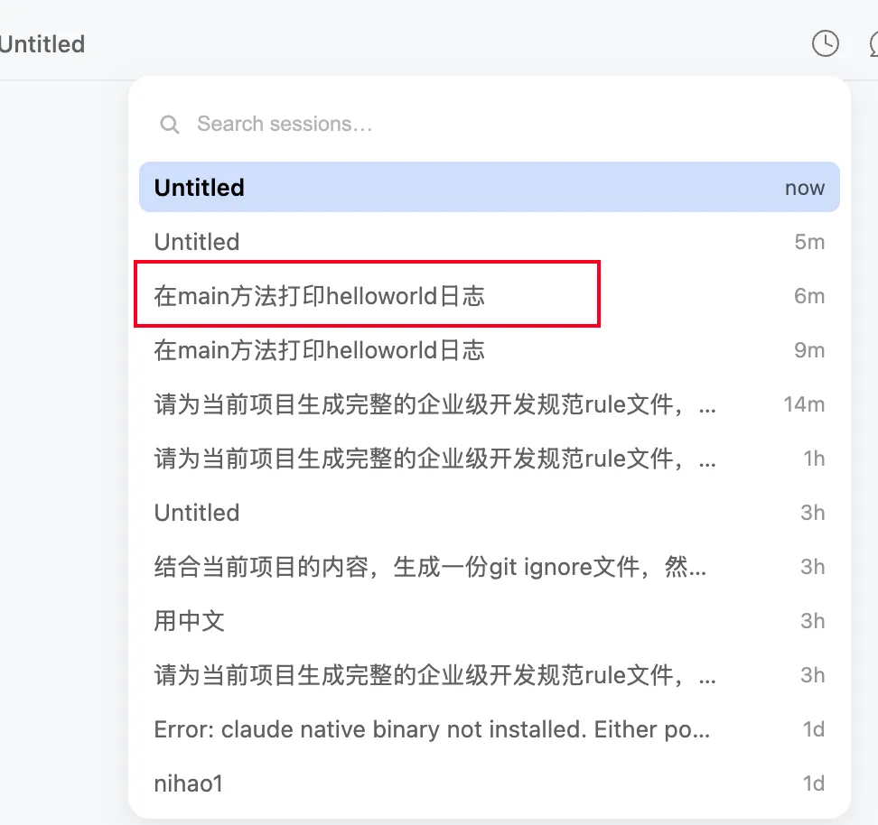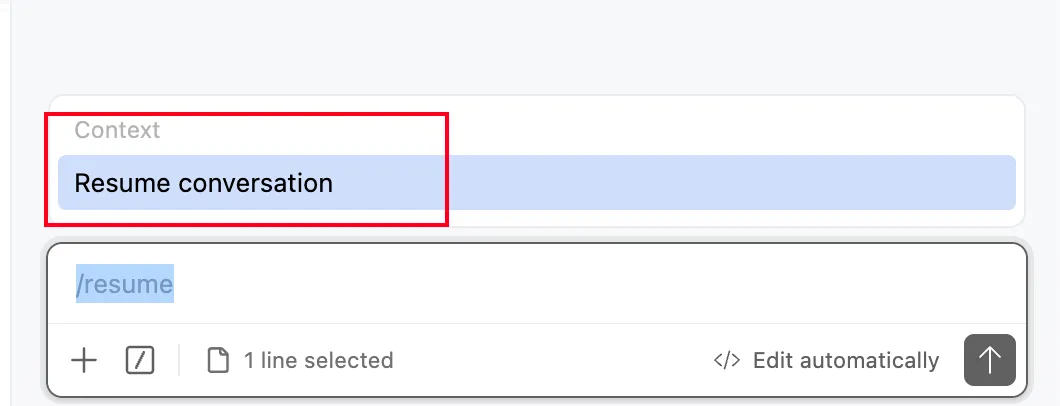 例如:我们当前开启了全新的会话,希望继续接着上一轮helloworld日志打印的对话,我们只需键入/resume,选择resume conversation(若是终端界面则直接回车即可):